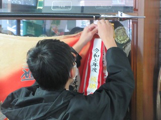 さ~キャプテンのてによって「優勝ペナント」が取り付けられます。