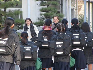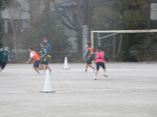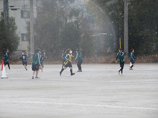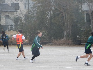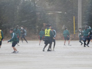 薄日が差してきた午後ですが、時折「雪」が舞うグラウンドでは、3年生のガールズチームの体育が元気に行われています。