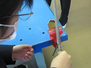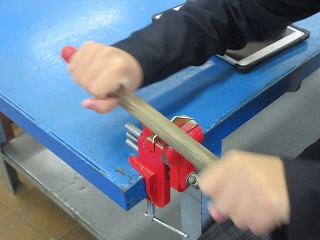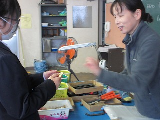 3年生の技術は「金工」です。金属を曲げたり、切ったり、削ったりという金属加工です。今回はオリジナルキーホルダーの製作だそうです。