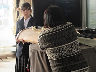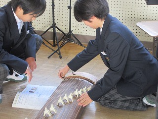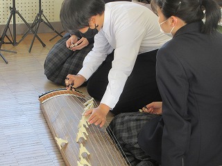 1年生の音楽は箏(そう)の演奏です。お題は「さくら さくら」です。