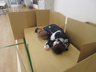 先生たちも「段ボールベッド」の使い心地を体験です。